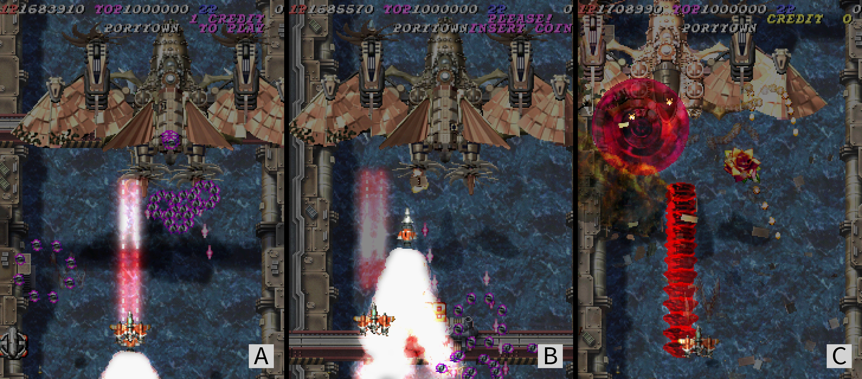 - Type C: Homing missile with continuous trail. Can be difficult to control when many enemies are present.